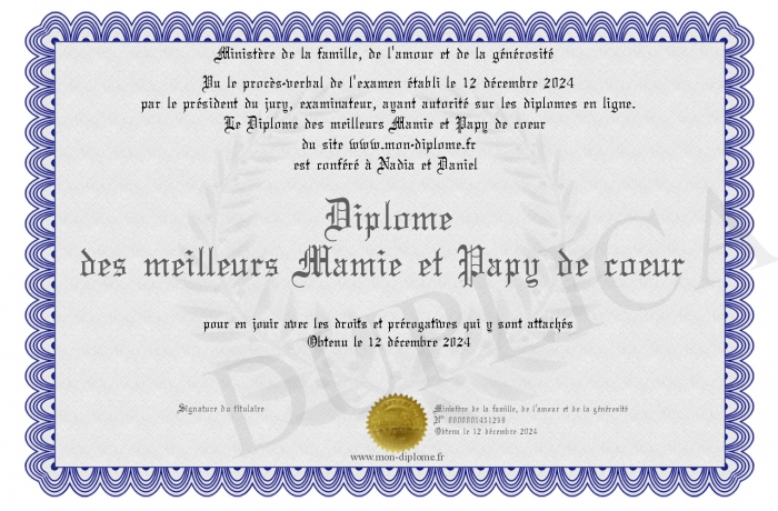 Envoyez par email votre Diplôme des meilleurs Mamie et Papy de coeur personalisé