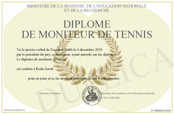 Envoyez par email votre diplôme de moniteur de tennis personalisé