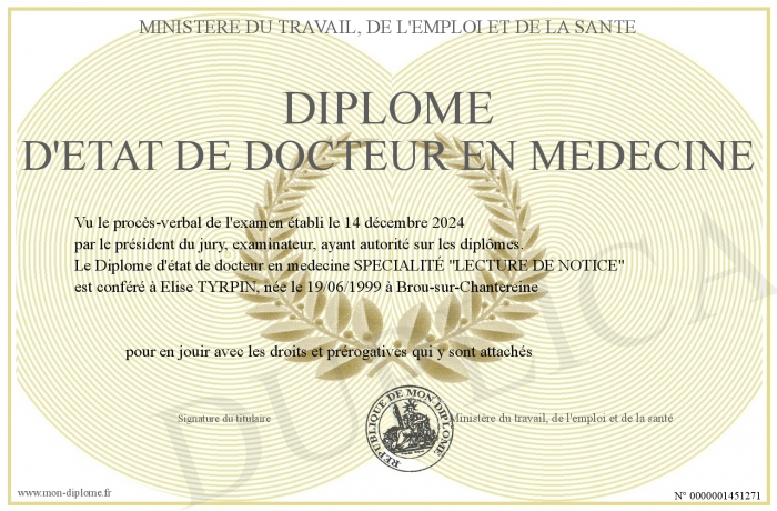Envoyez par email votre Diplome d'état de docteur en medecine personalisé