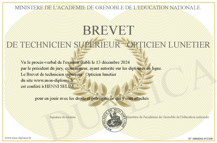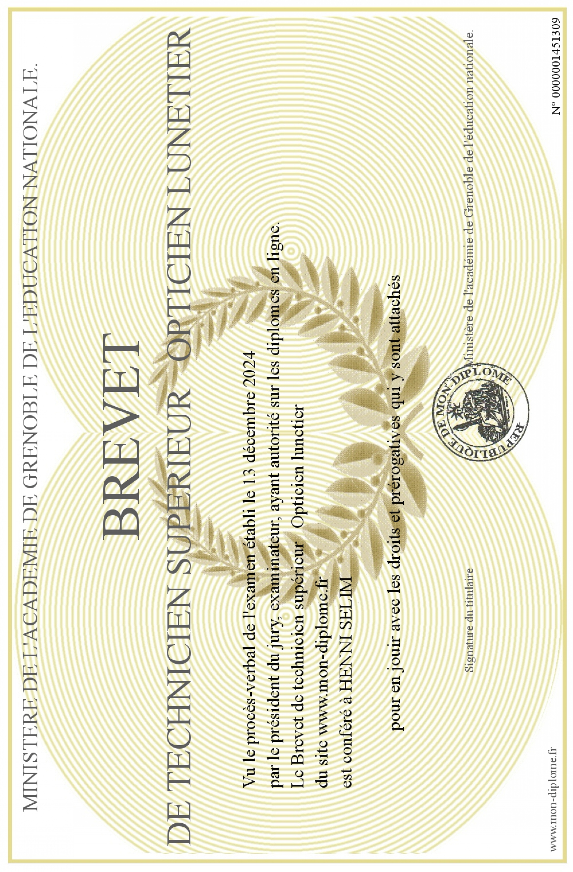 Envoyez par email votre Brevet de technicien supérieur Opticien lunetier personalisé