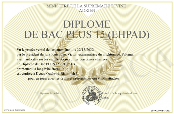 Envoyez par email votre Diplôme de Bac PLUS 15 (EHPAD) personalisé