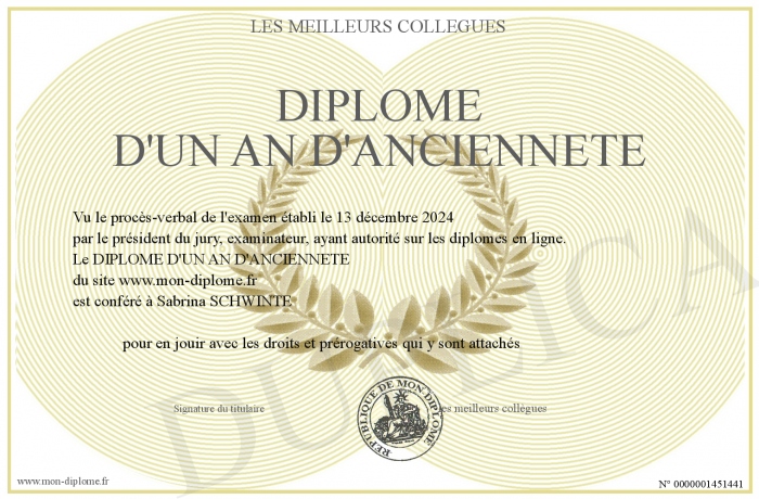Envoyez par email votre DIPLOME D'UN AN D'ANCIENNETE personalisé