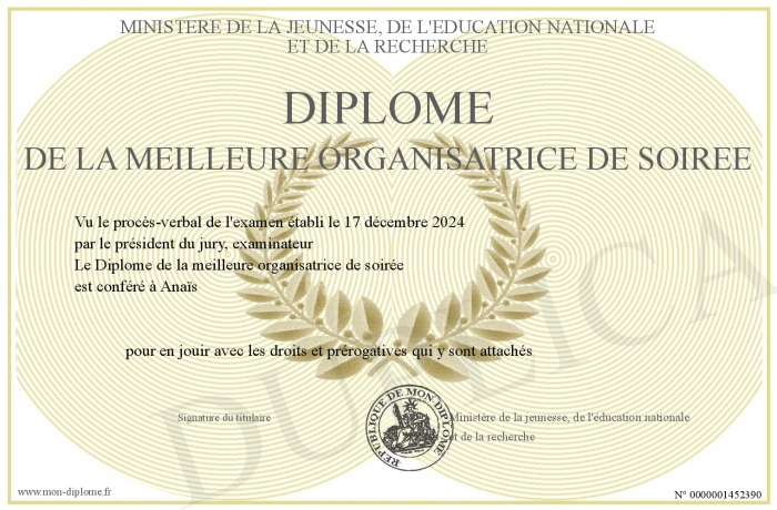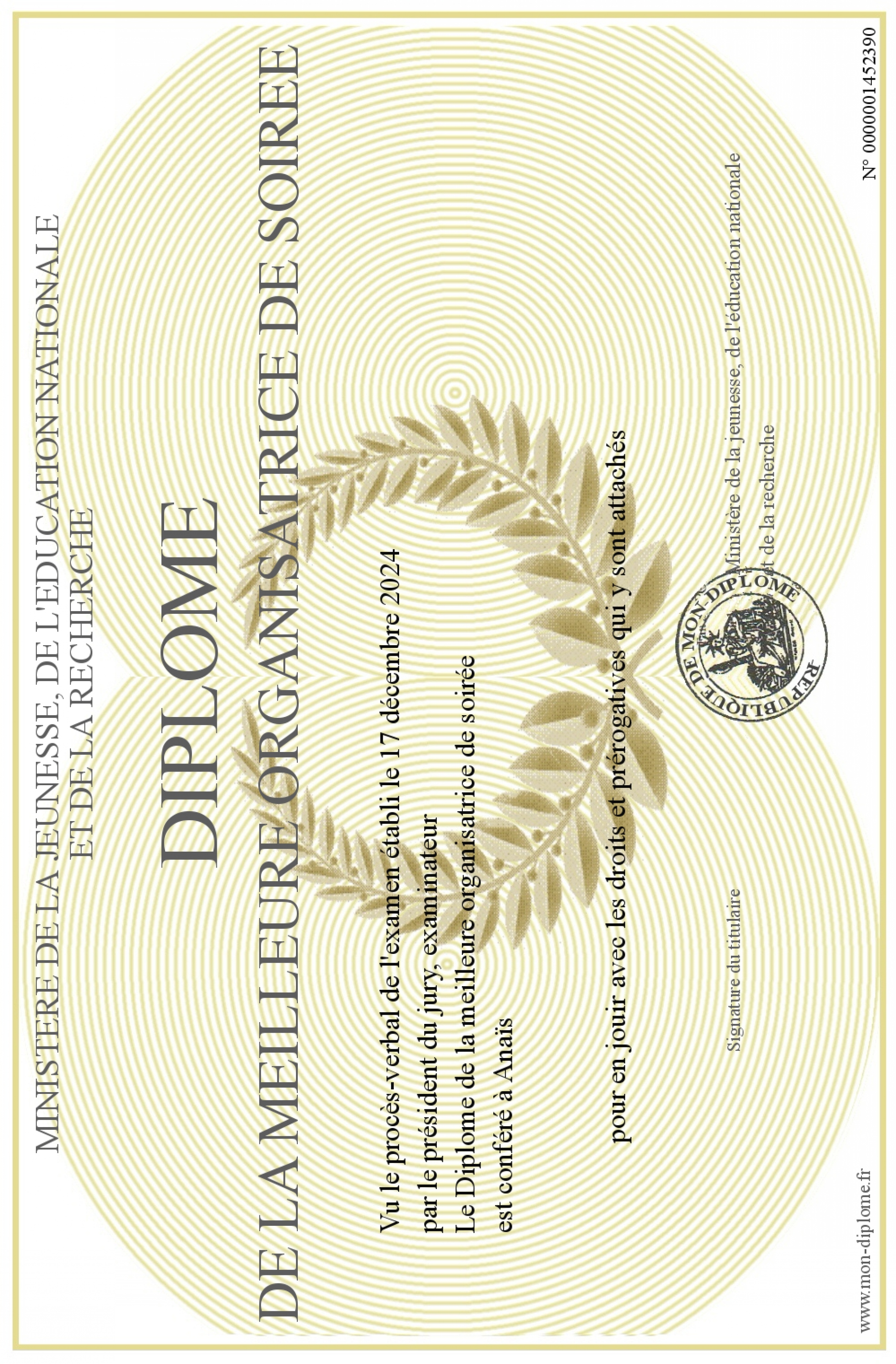 Envoyez par email votre Diplôme de la meilleure organisatrice de soirée personalisé