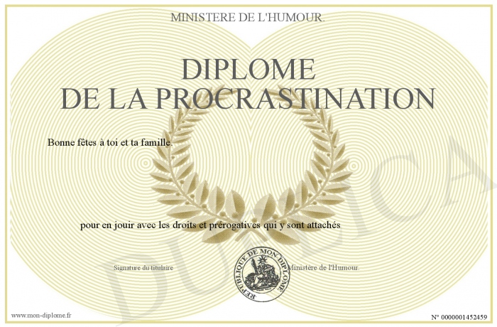 Envoyez par email votre Diplôme de la Procrastination personalisé