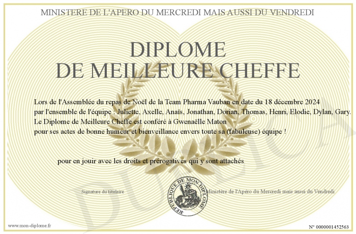 Envoyez par email votre Diplôme de Meilleure Cheffe personalisé
