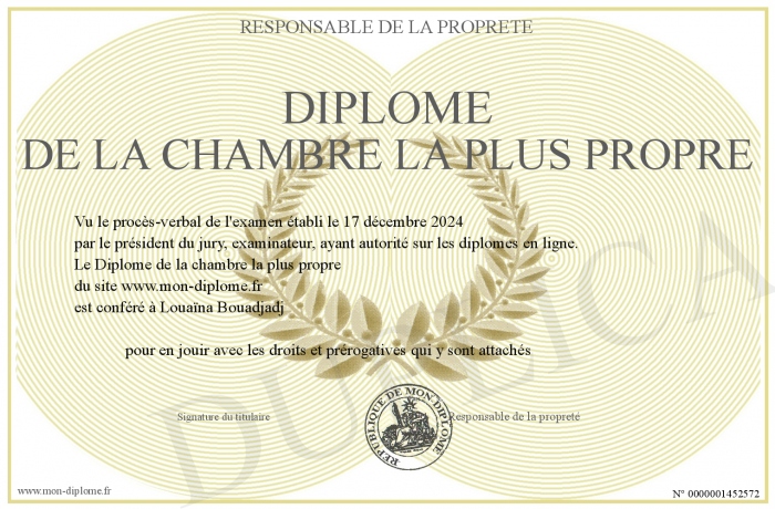 Envoyez par email votre Diplôme de la chambre la plus propre personalisé
