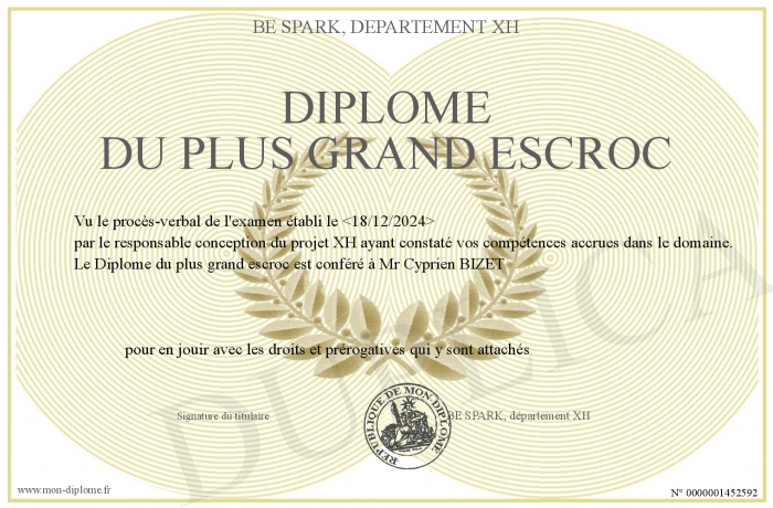 Envoyez par email votre Diplôme du plus grand escroc personalisé