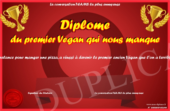 Envoyez par email votre Diplome du premier Vegan qui nous manque personalisé