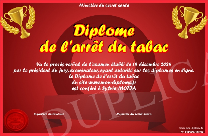 Envoyez par email votre Diplôme de l'arrêt du tabac personalisé
