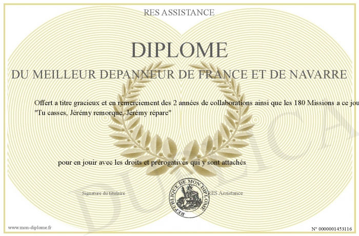 Envoyez par email votre Diplôme du meilleur dépanneur de FRANCE et de NAVARRE personalisé