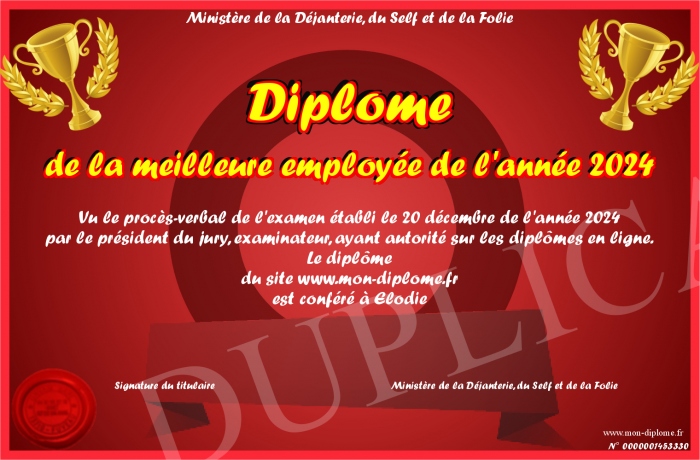 Envoyez par email votre Diplôme de la meilleure employée de l'année 2024 personalisé