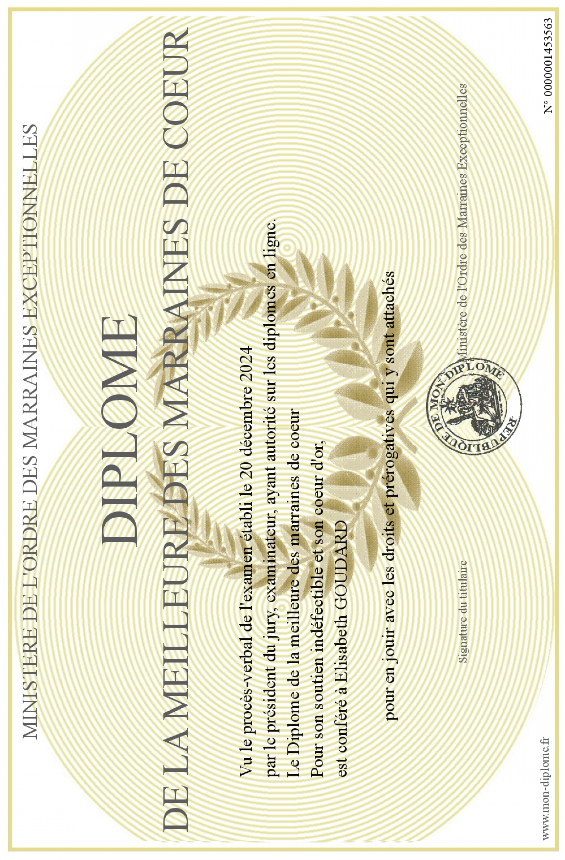 Envoyez par email votre Diplôme de la meilleure des marraines de coeur personalisé