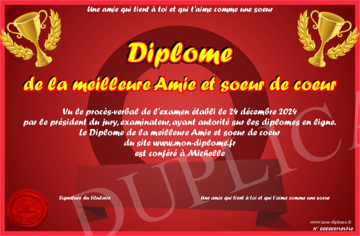 Envoyez par email votre Diplome de la meilleure Amie et soeur de coeur personalisé