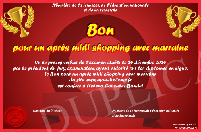 Envoyez par email votre Bon pour un après midi shopping avec marraine personalisé