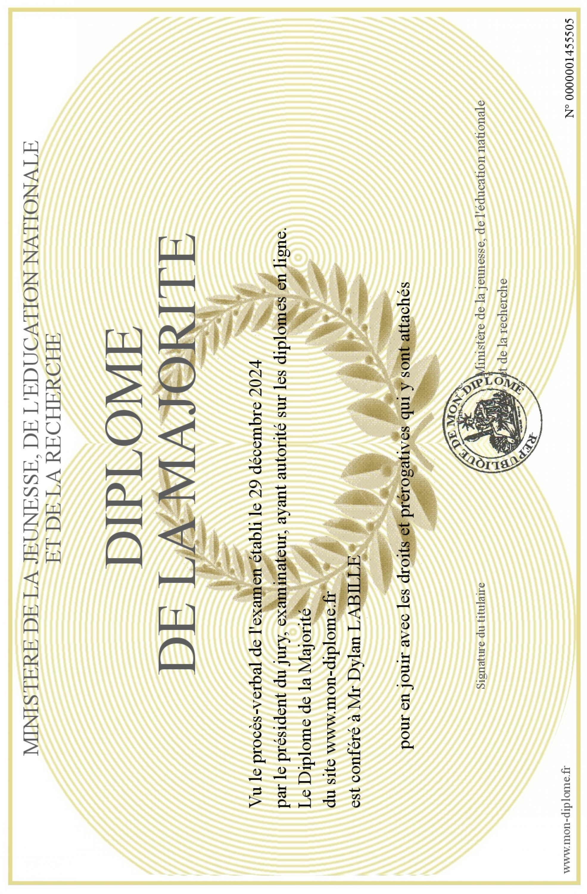 Envoyez par email votre Diplôme de la Majorité personalisé