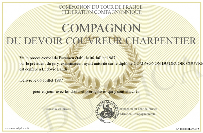 Envoyez par email votre COMPAGNON DU DEVOIR COUVREUR CHARPENTIER personalisé