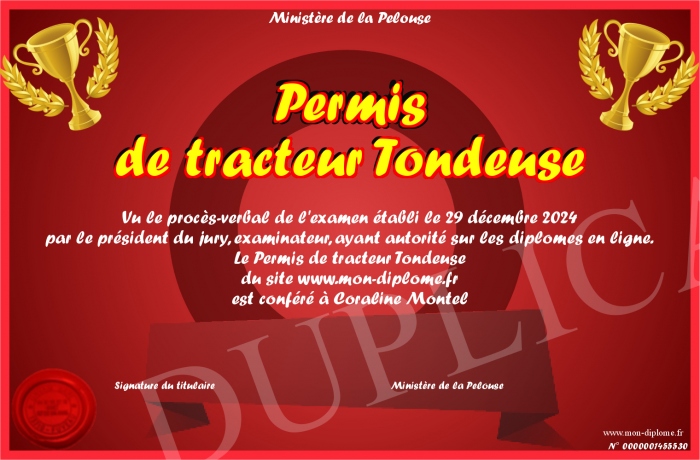Envoyez par email votre Permis de tracteur Tondeuse personalisé