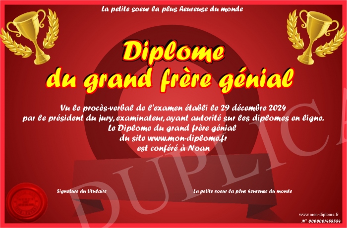 Envoyez par email votre Diplôme du grand frère génial personalisé