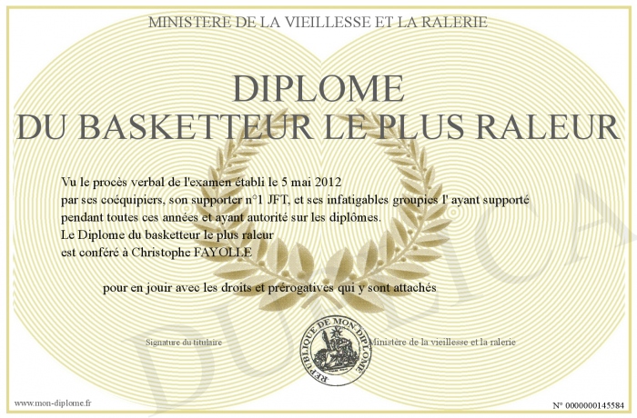 Envoyez par email votre Diplôme du basketteur le plus raleur personalisé
