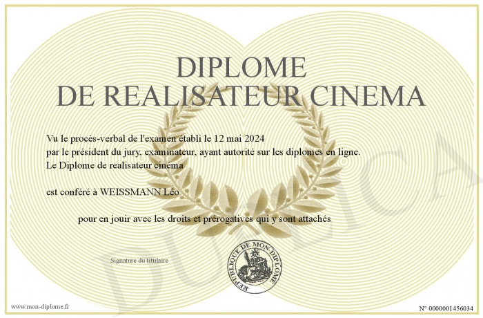 Envoyez par email votre Diplôme de realisateur cinéma personalisé