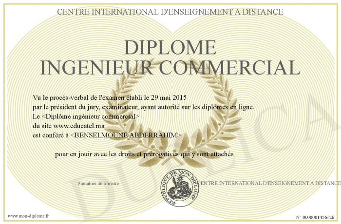 Envoyez par email votre Diplôme ingénieur commercial personalisé