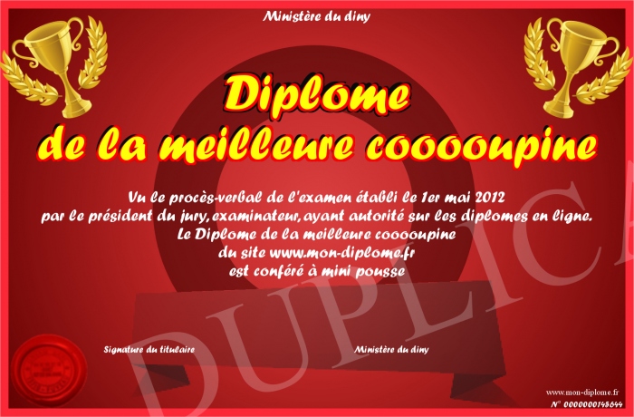 Envoyez par email votre Diplome de la meilleure cooooupine personalisé
