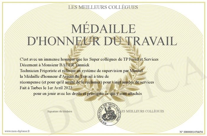 Envoyez par email votre MÉDAILLE D'HONNEUR DU TRAVAIL personalisé
