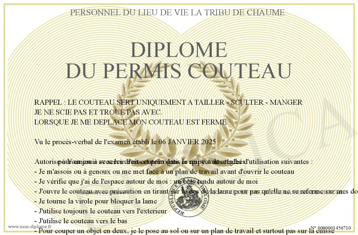 Envoyez par email votre Diplôme du PERMIS COUTEAU personalisé