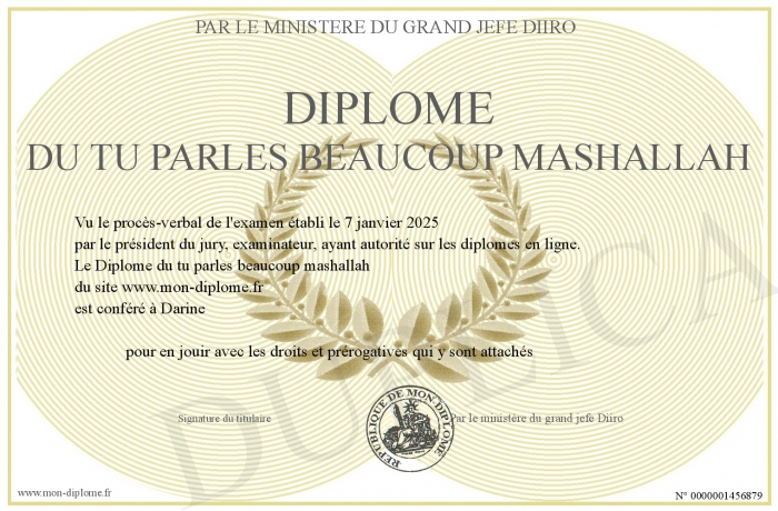 Envoyez par email votre Diplôme du tu parles beaucoup mashallah personalisé