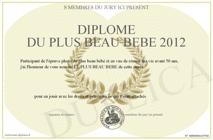 Envoyez par email votre Diplôme du plus beau bébé 2012 personalisé