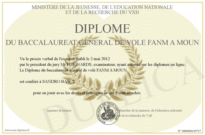 Envoyez par email votre Diplôme du baccalaureat général de volé FANM A MOUN personalisé