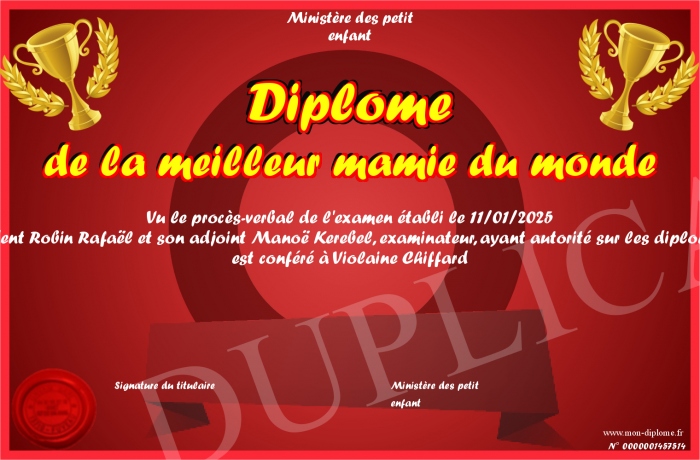 Envoyez par email votre Diplôme de la meilleur mamie du monde personalisé