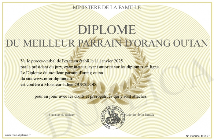 Envoyez par email votre Diplôme du meilleur parrain d'orang outan personalisé