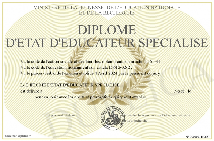 Envoyez par email votre DIPLOME D'ETAT D'EDUCATEUR SPECIALISE personalisé