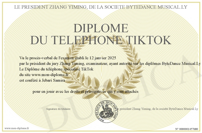 Envoyez par email votre Diplôme du Téléphone TikTok personalisé