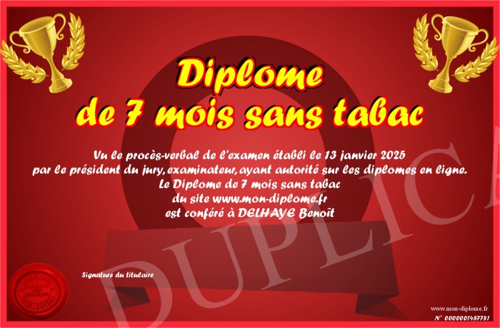 Envoyez par email votre Diplôme de 7 mois sans tabac personalisé