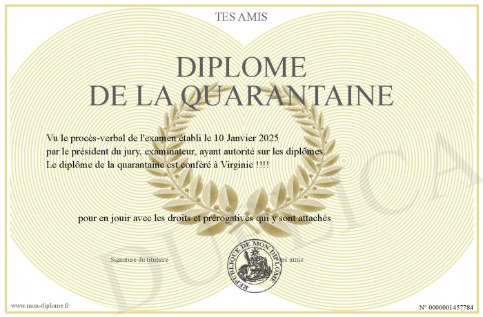 Envoyez par email votre Diplôme de la quarantaine personalisé
