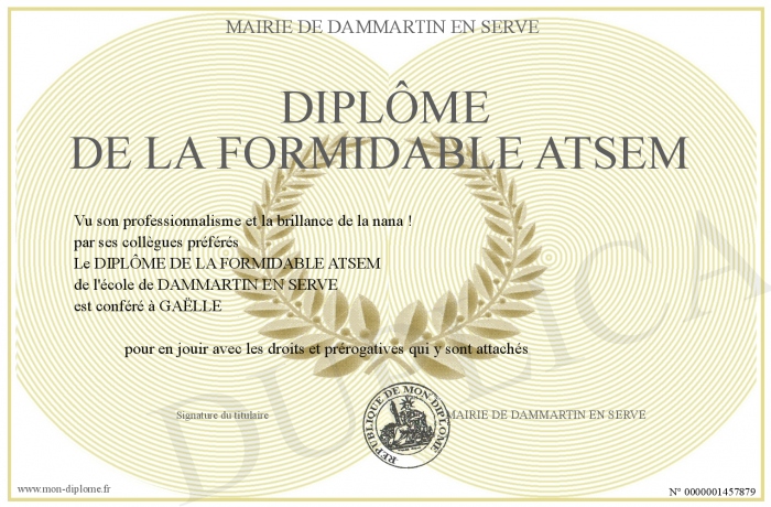 Envoyez par email votre DIPLÔME DE LA FORMIDABLE ATSEM personalisé