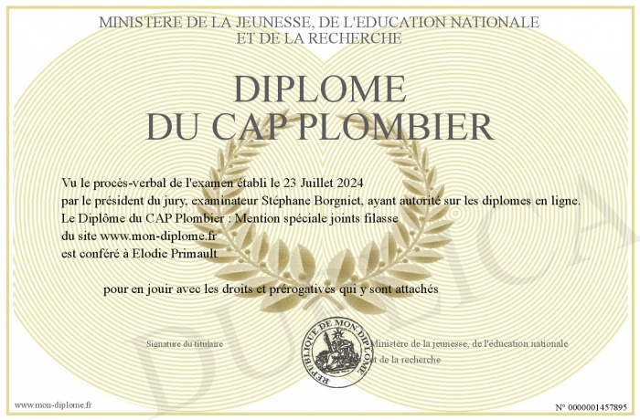 Envoyez par email votre Diplôme du CAP Plombier personalisé