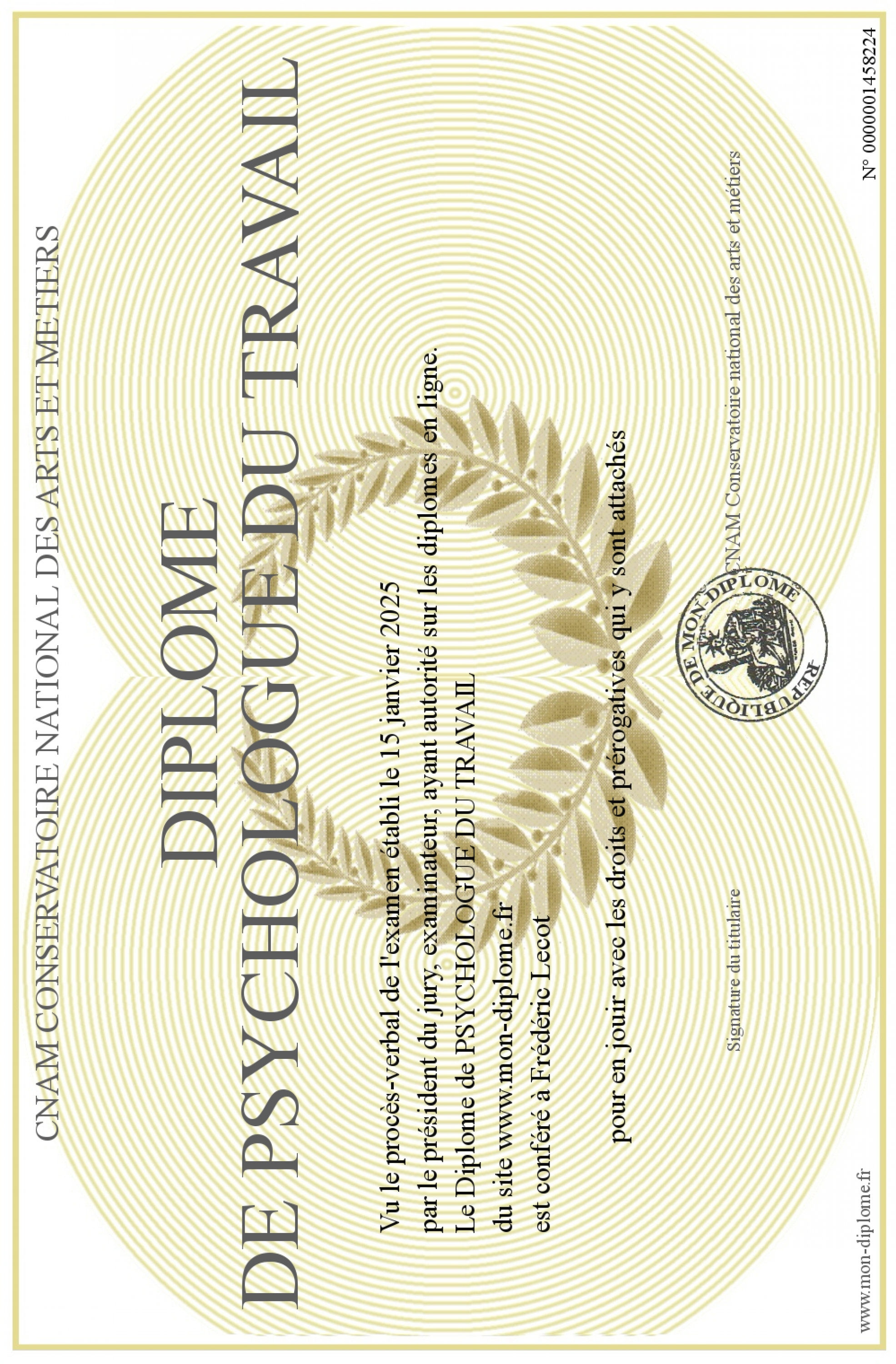 Envoyez par email votre Diplôme de PSYCHOLOGUE DU TRAVAIL personalisé