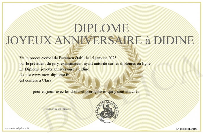 Envoyez par email votre Diplôme joyeux anniversaire à didine personalisé