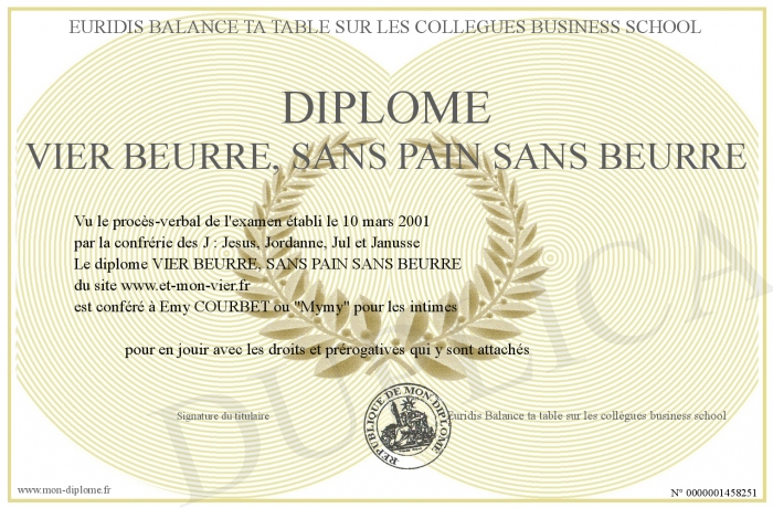 Envoyez par email votre diplôme VIER BEURRE, SANS PAIN SANS BEURRE personalisé