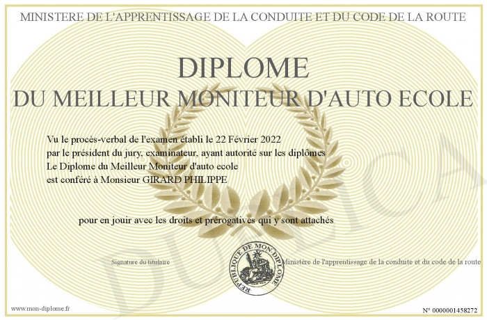 Envoyez par email votre Diplôme du Meilleur Moniteur d'auto ecole personalisé