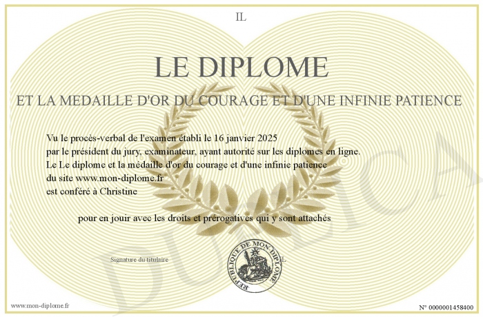 Envoyez par email votre Le diplôme et la médaille d'or du courage et d'une infinie patience personalisé