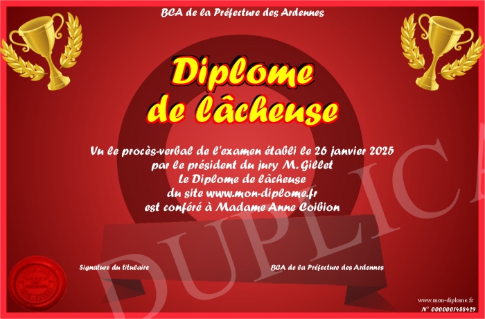 Envoyez par email votre Diplôme de lâcheuse personalisé