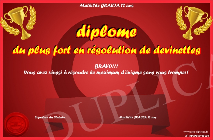 Envoyez par email votre diplome du plus fort en résolution de devinettes personalisé