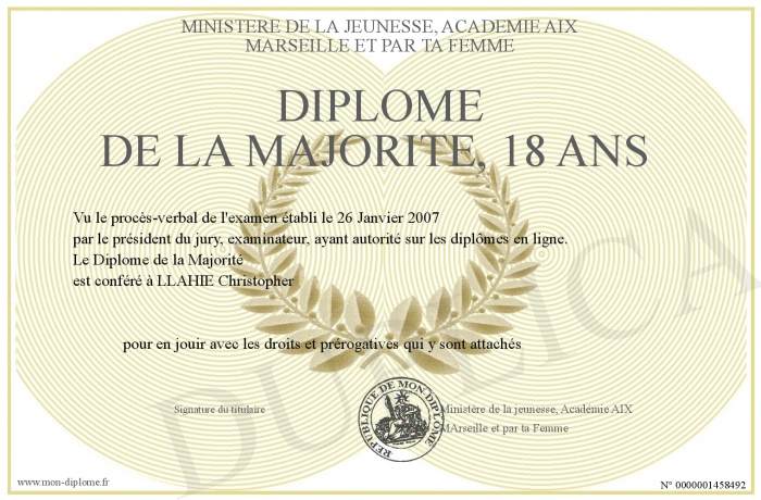 Envoyez par email votre Diplôme de la Majorité, 18 ans personalisé