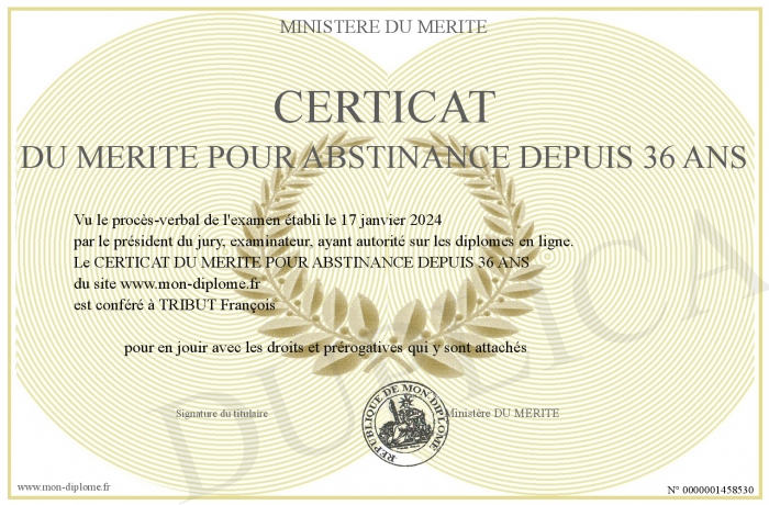 Envoyez par email votre CERTICAT DU MERITE POUR ABSTINANCE DEPUIS 36 ANS personalisé