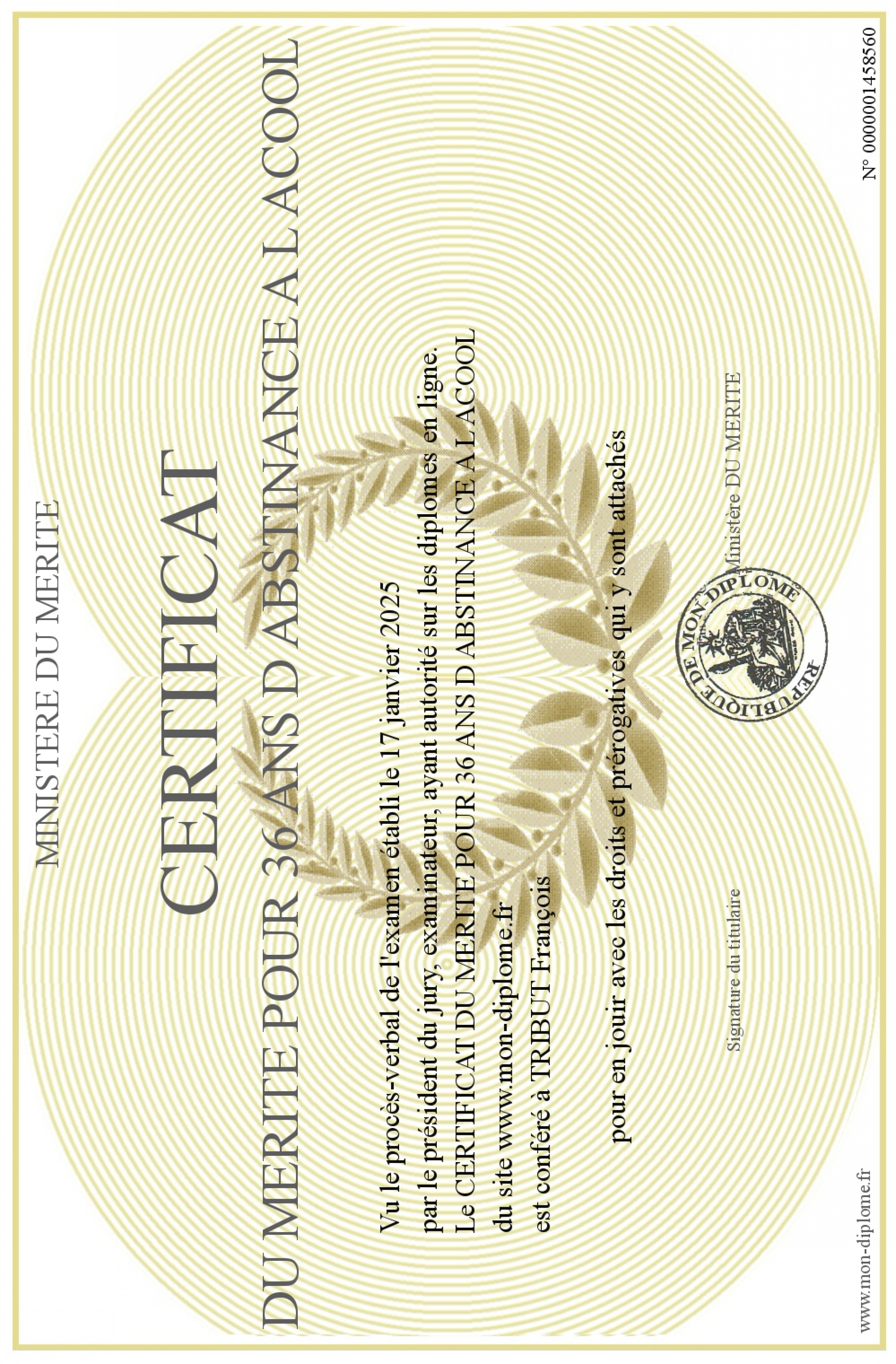Envoyez par email votre CERTIFICAT DU MERITE POUR 36 ANS D ABSTINANCE A L ACOOL personalisé