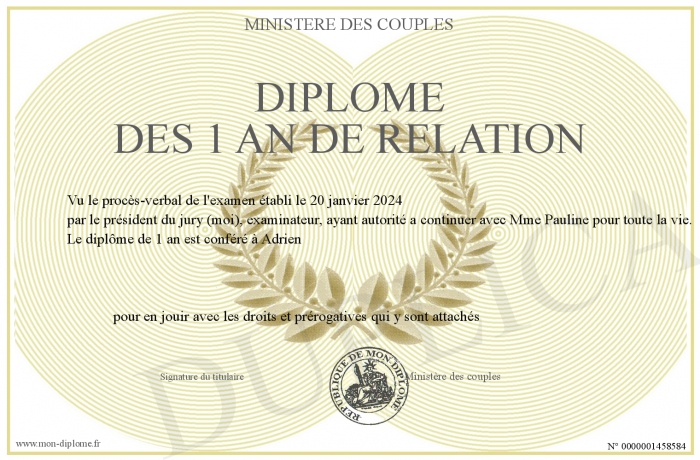 Envoyez par email votre Diplôme des 1 an de relation personalisé